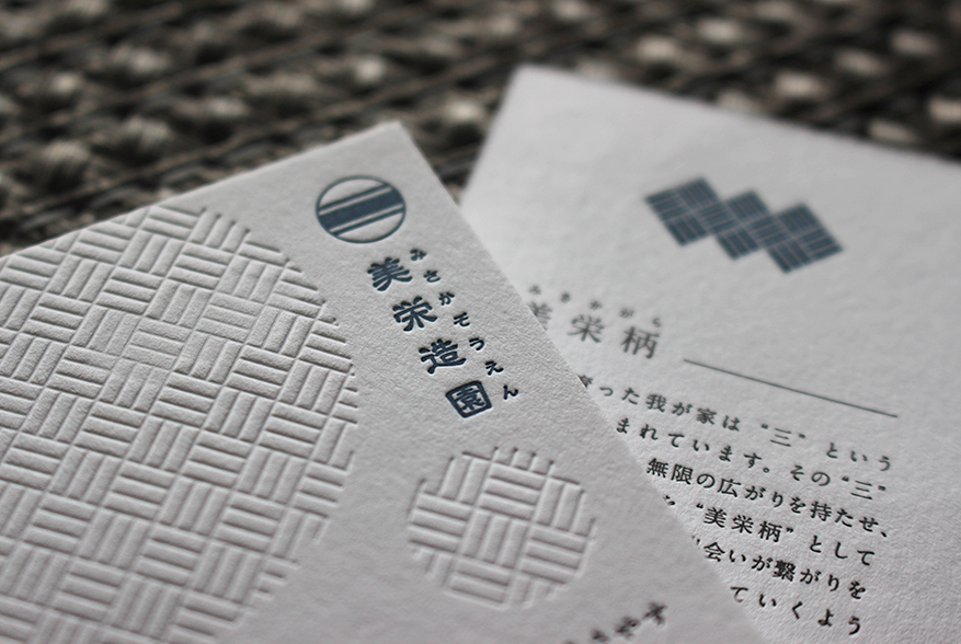 コットン100%で優しい風合いが人気のクレーンレトラ(スノーホワイト・199K)に両面2色の活版印刷と表面に空押し(色なしで凹ませる)の仕様で制作させて頂きました。クレーンレトラは紙の表面が柔らかいため、版が紙に刺さりやすく空押しでもしっかりと存在感を出すことが出来ました。あまり圧をかけすぎると紙の表面が割れてしまうため、割れないギリギリのところを探りながら加工しました。