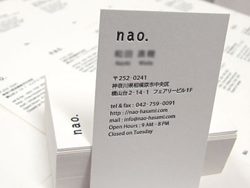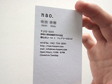 相模原市にあるヘアサロンnao.様の名刺とショップカードを制作させて頂きました。活版によりギュッと深く印刷された墨文字が白の紙と相俟ってコントラストが引き立ちます。